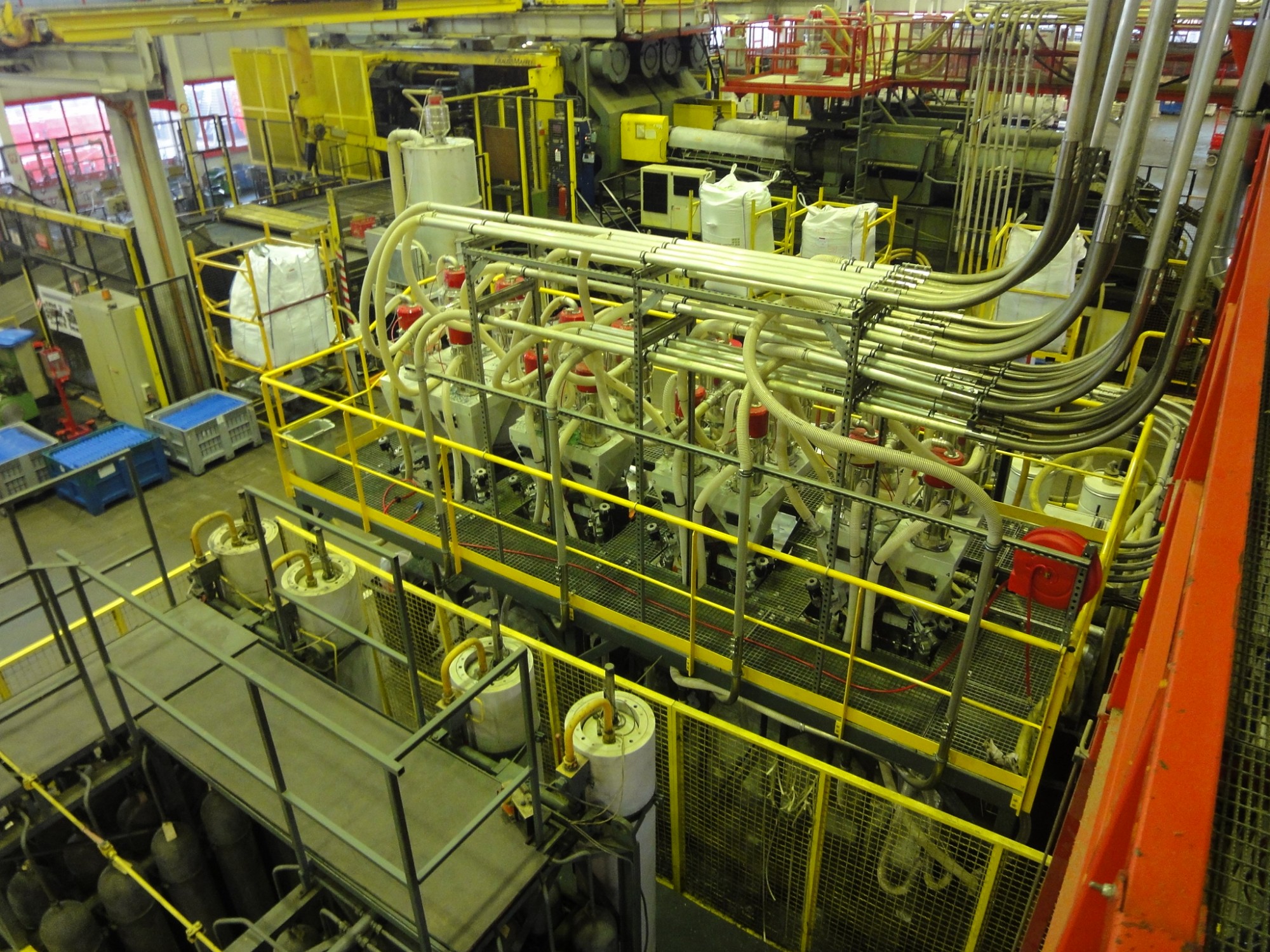 Alimentation d'un parc de presse à injecter depuis des doseurs sur plateforme.