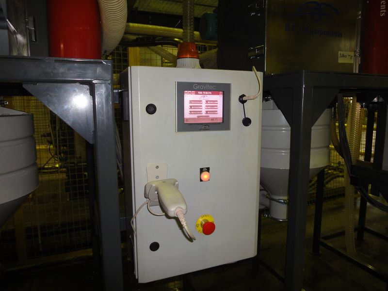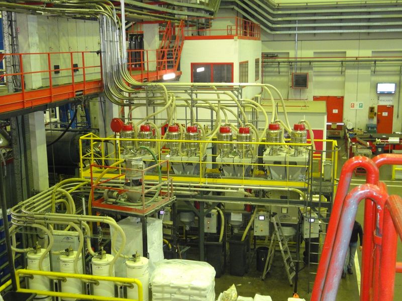 Distribution matière centralisée depuis des silos de stockage vers des doseurs ponderaux en pied de presse.
