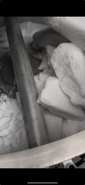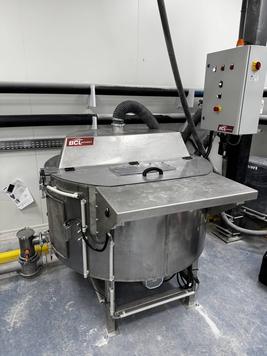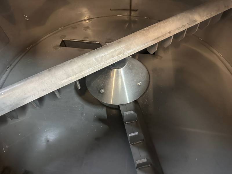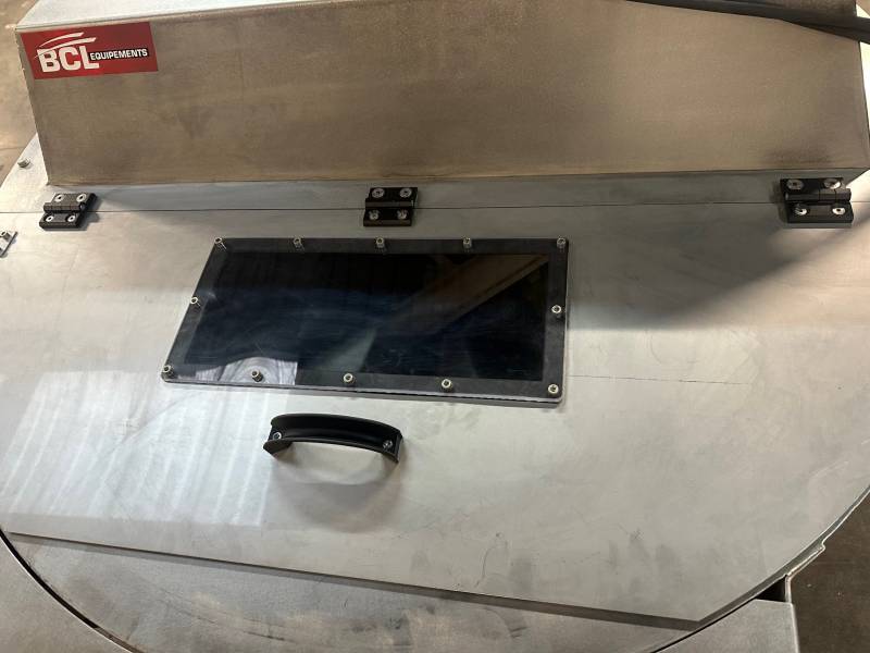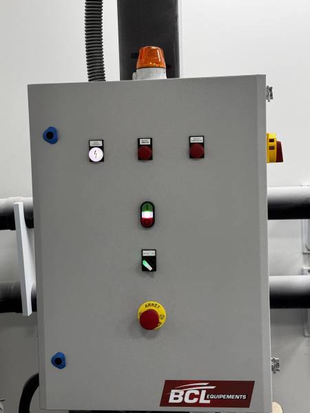 L'équipement se compose d'une trémie inox à fond plat de capacité 600 litres, avec peigne rotatif en deux parties (fixe et mobile), permettant de casser les blocs. Conduit à vis d'extraction et dosage matière pour alimentation d'un équipement de reprise matière. Couvercle basculant avec conduit permettant le raccordement d'un système de récupération des poussières.