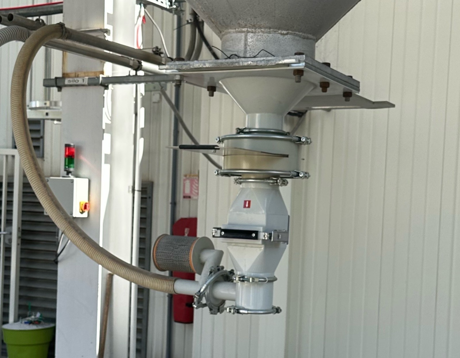 Entretoise sous silo avec tiroir et grenouillères permettant de capter par l’intermédiaire d'une grille, les fines et cheveux d'anges générés par le transfert matière camion vers silo.